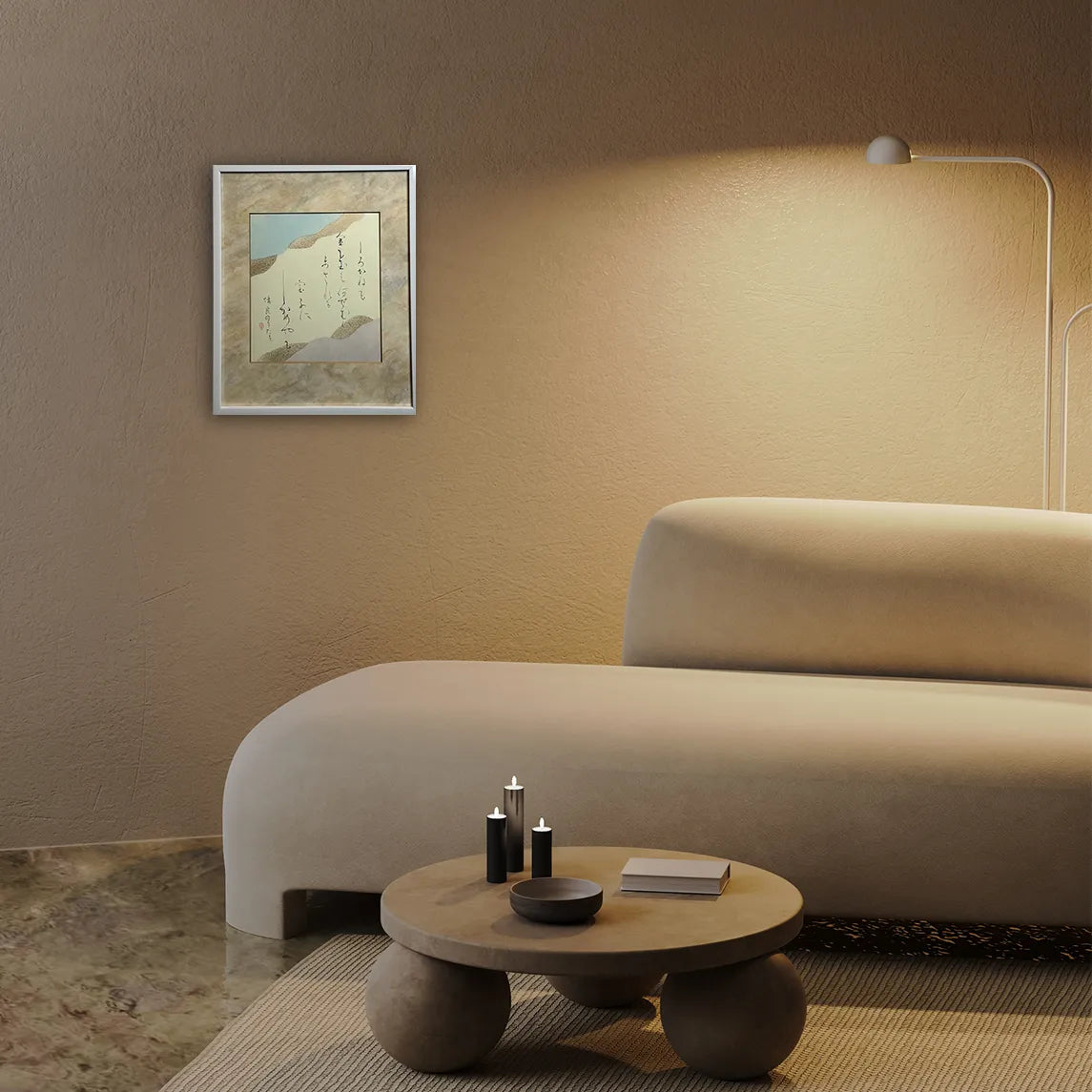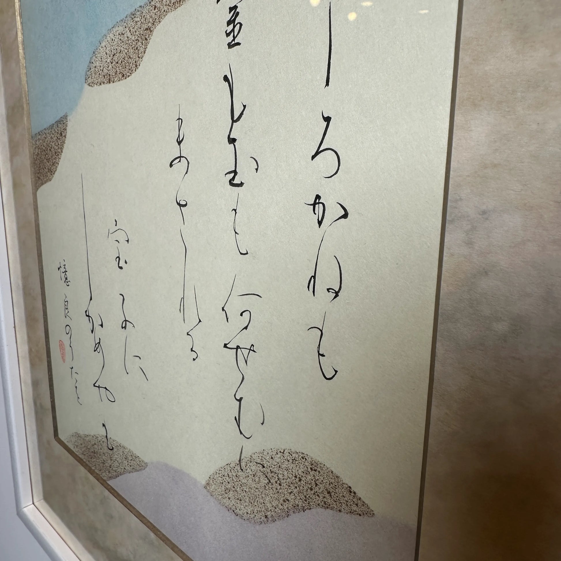 漢字とひらがなで書かれた作品です。書道作品でありながら、西洋のような色合いで華やかに、現代の家にも馴染むでしょう。