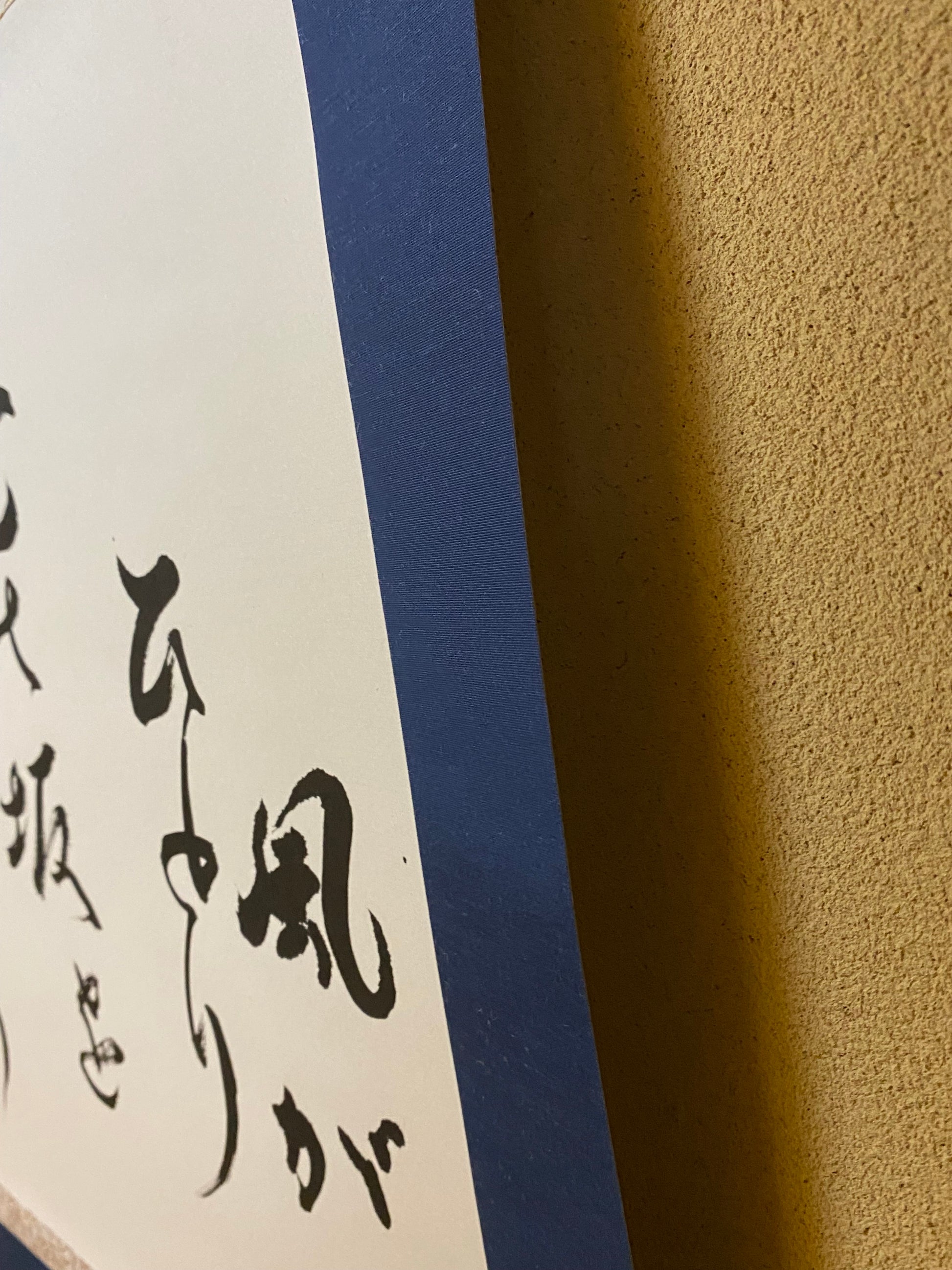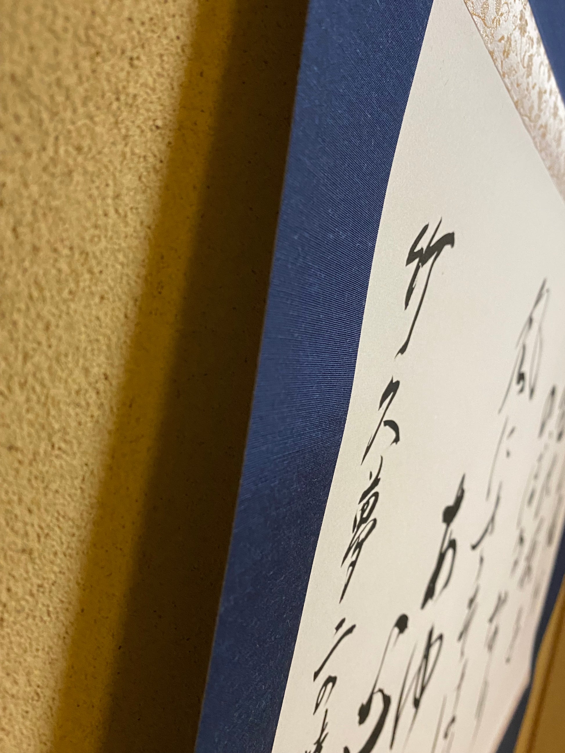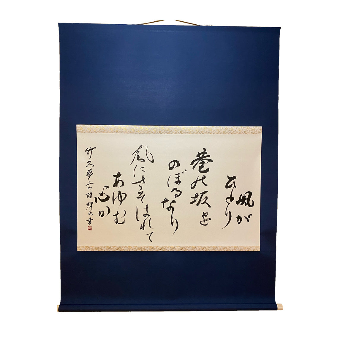 書道の作品には、様々な作品があります。こちらの作品は〝読める〟作品です。詩を読み、その書から情景が浮かんできます。大きめの掛け軸ですが、色も美しくシンプルですのでモダンな空間にもおすすめです。