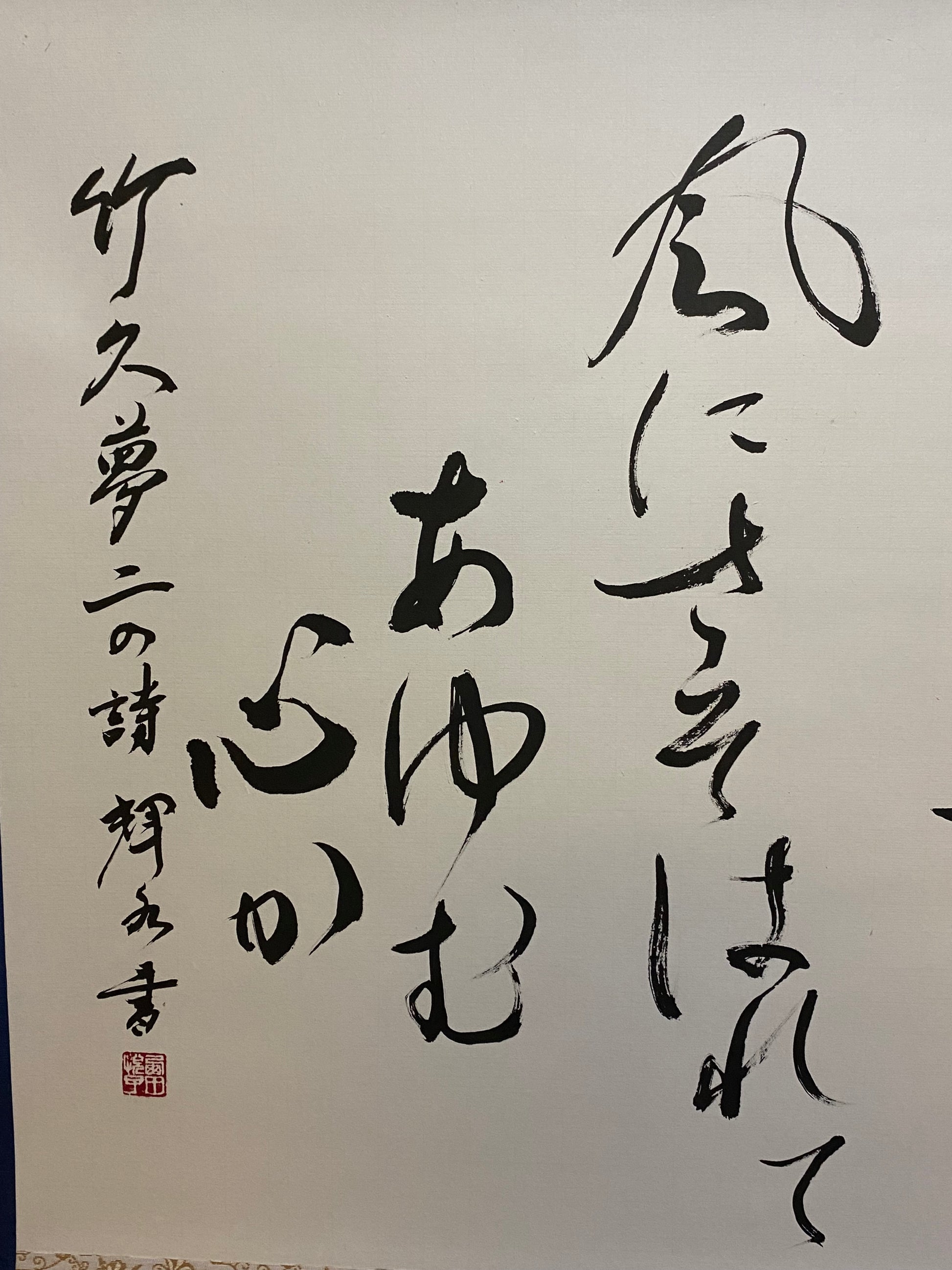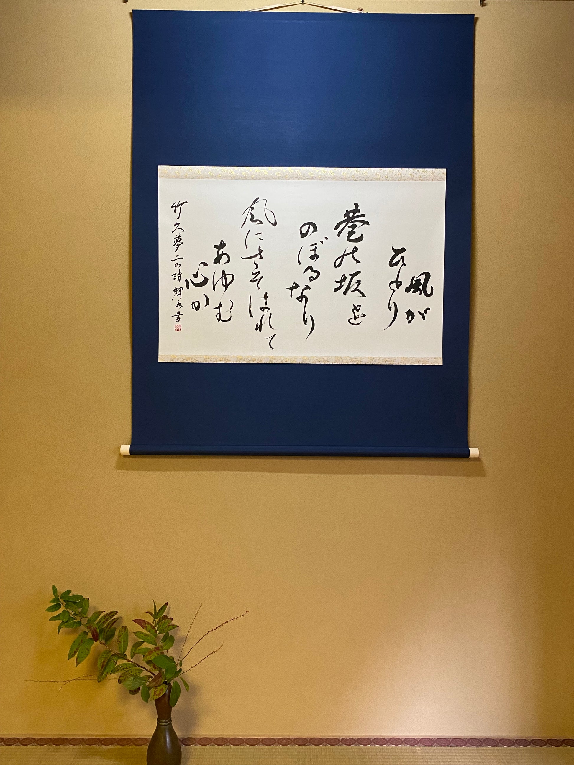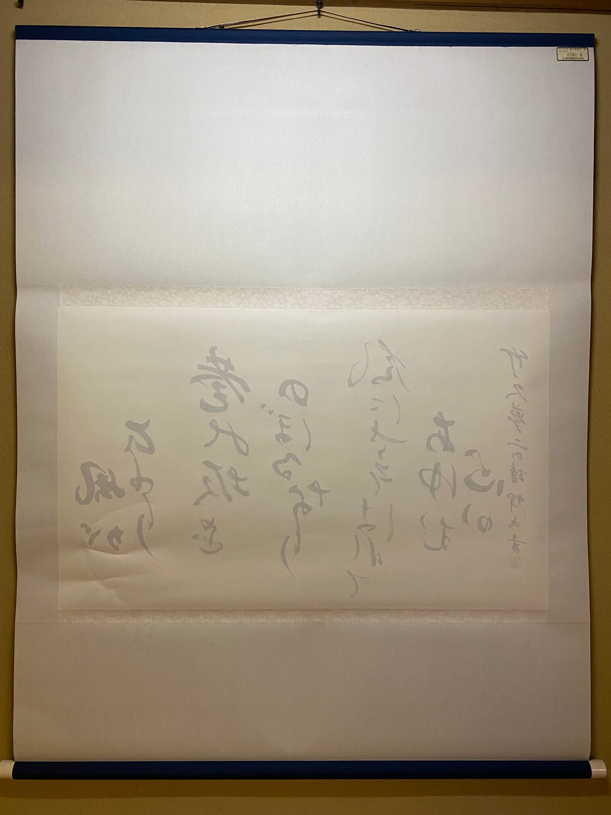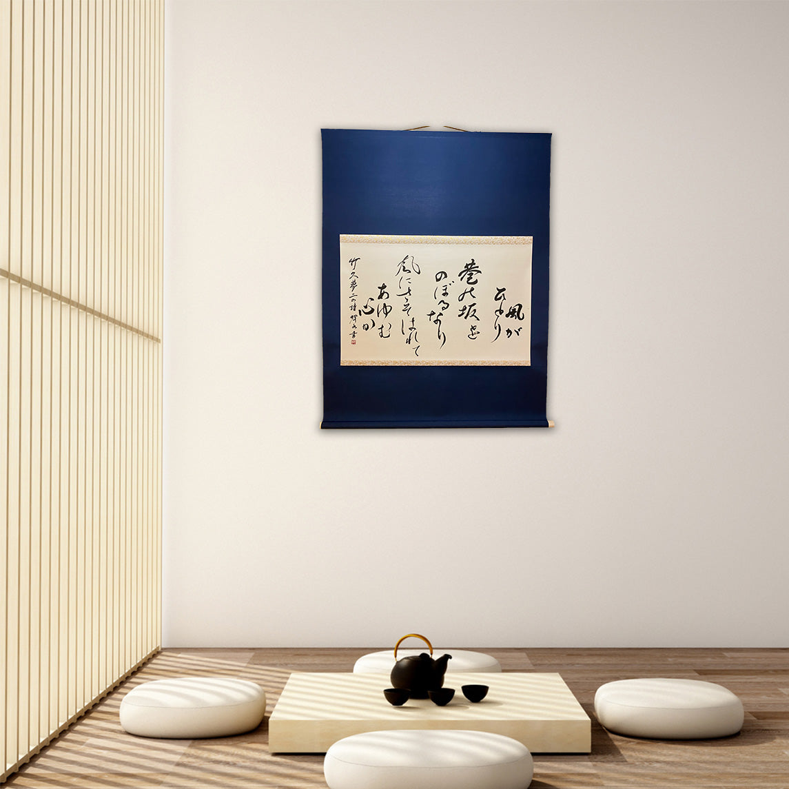 書道の作品には、様々な作品があります。こちらの作品は〝読める〟作品です。詩を読み、その書から情景が浮かんできます。大きめの掛け軸ですが、色も美しくシンプルですのでモダンな空間にもおすすめです。