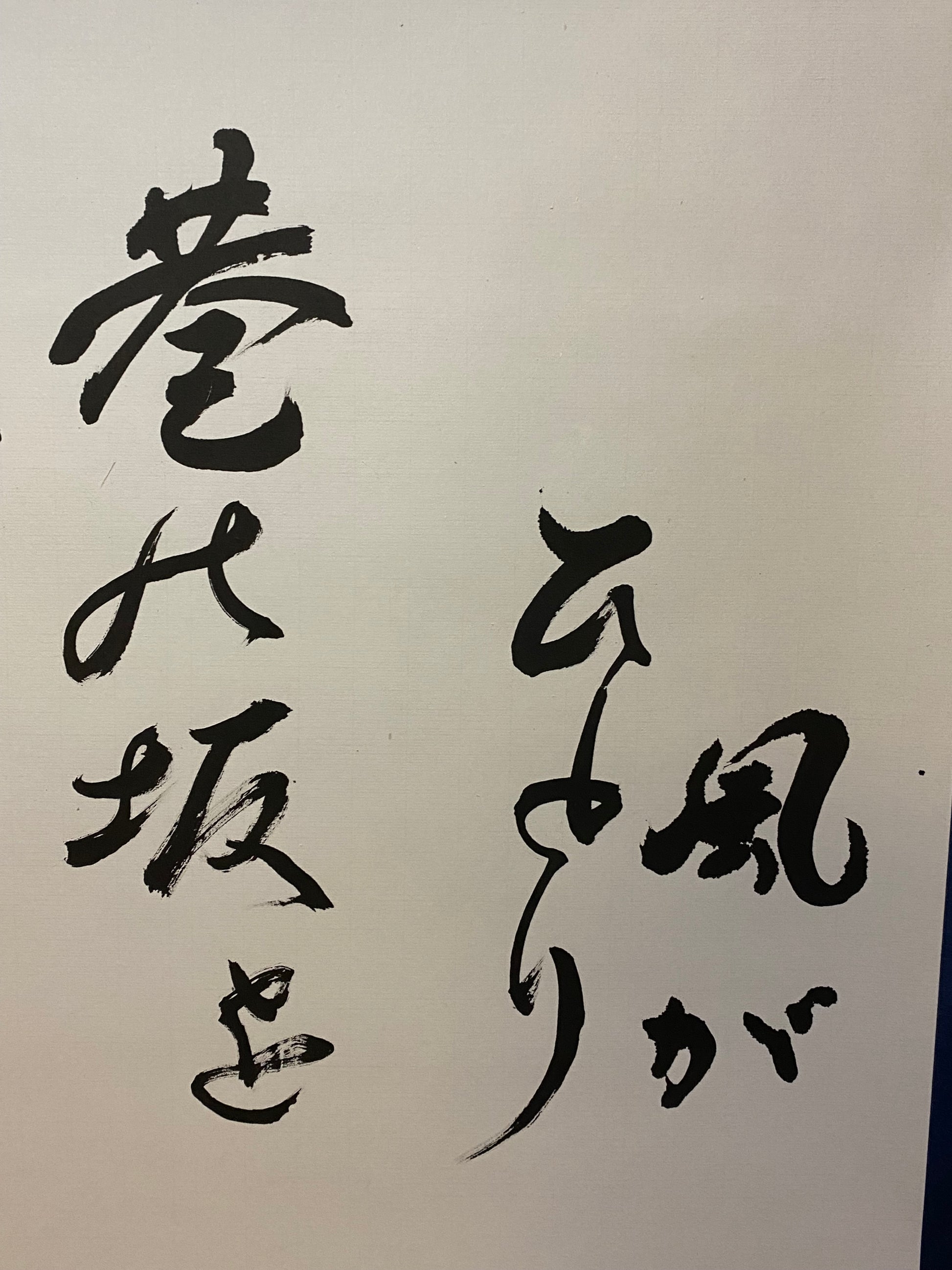 【SIZE】H1200mm×W930mm(作品部分の大きさH485mm×W385mm) 【WEIGHT】563g 【作品材料】 画仙紙 墨 【作品ストーリー】 "Kazega hitori minatono sakawo noborunari kazenisasowarete ayumukokoroka” 【作品のポイント】 The word 風(wind) is used twice in this poem. Therefore, the thickness of the these two 風 is drawn differently to put the accent on the piece of work. |