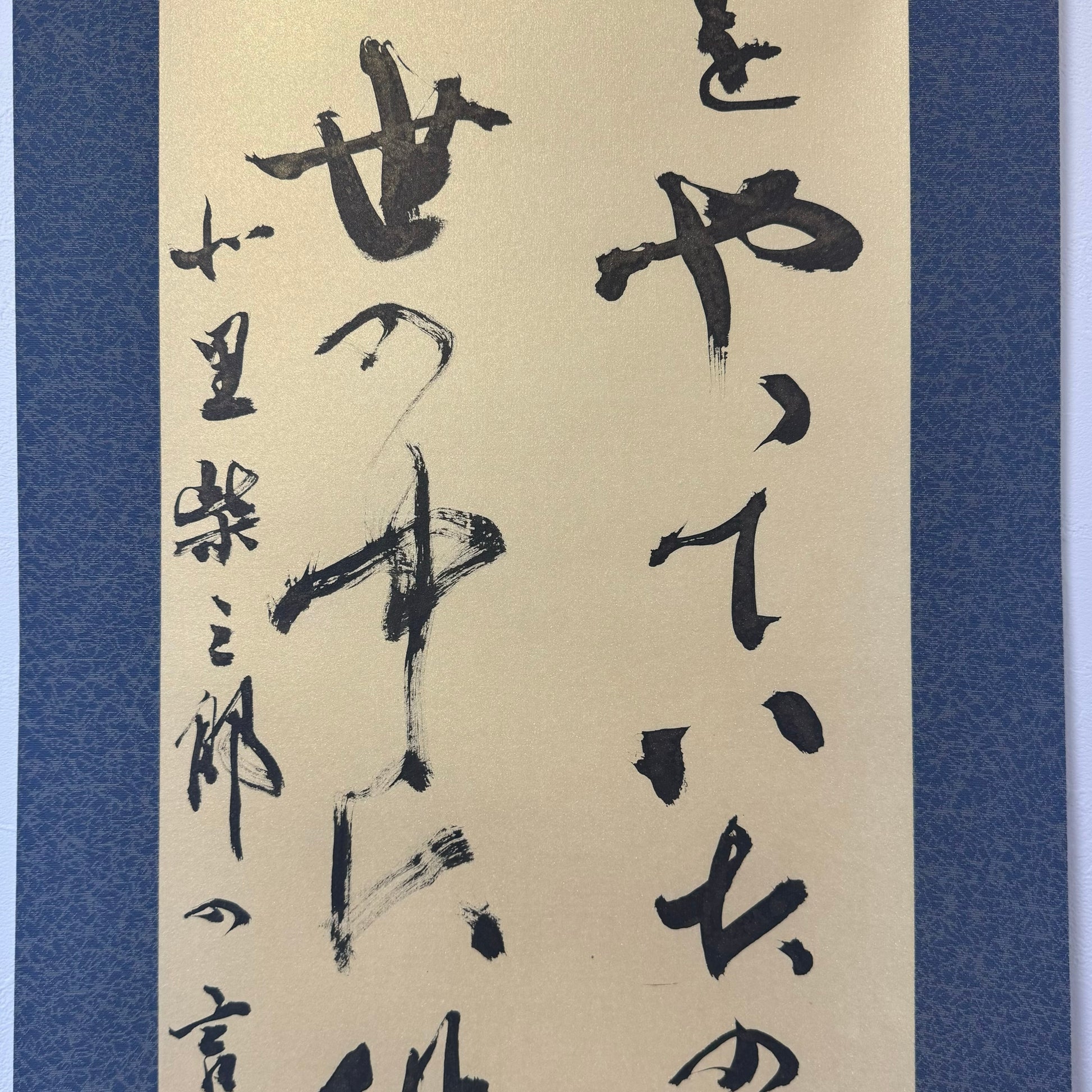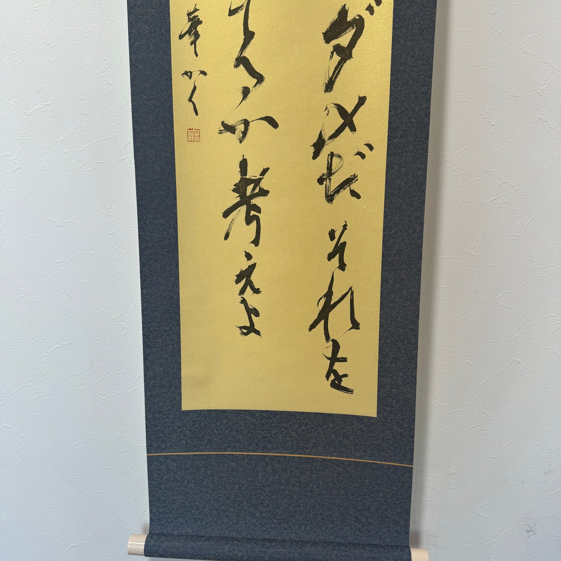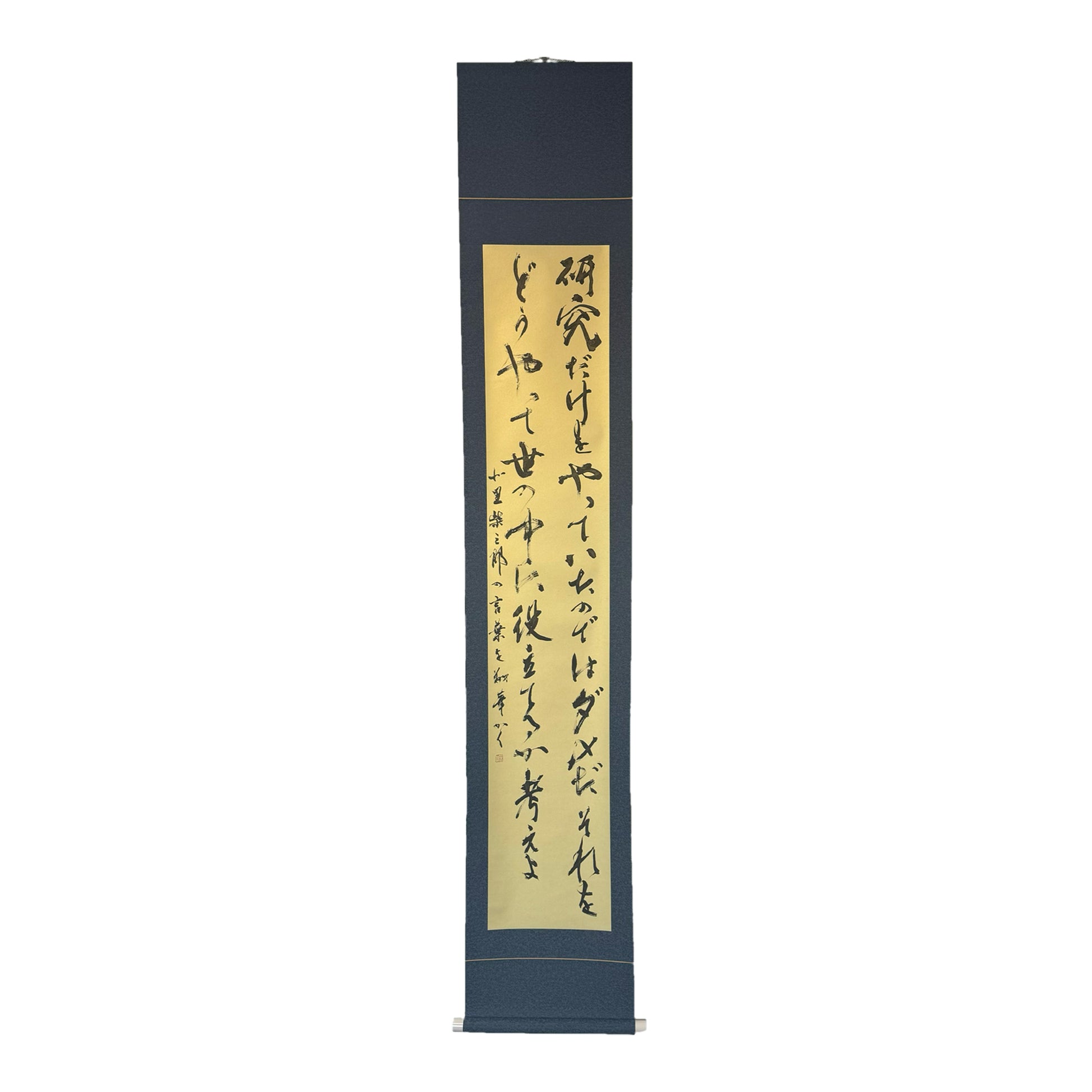 【SIZE】H2020mm×W360mm×D30mm(作品部分 H1450mm×W2580mm) 【WEIGHT】370g 【作品材料】墨、金色の紙 【作品ストーリー】 「研究だけをやっていたのではダメだ それをどうやって世の中に役立てるか考えよ」 2024年上半期新札が発行され、千円札の肖像となる北里柴三郎の言葉です。 私は大学や小学校で書写書道教育の研究をしていて、作品制作だけでなく論文を書くのですが、研究や論文を書いただけで満足していてはいけないと痛感した言葉です。 [In the words of Shibasaburo Kitasato] I have been researching calligraphy education at a university and an elementary school, writing papers as well as producing works of art, and these words made me keenly aware that I should not be satisfied with just doing research and writing papers. |