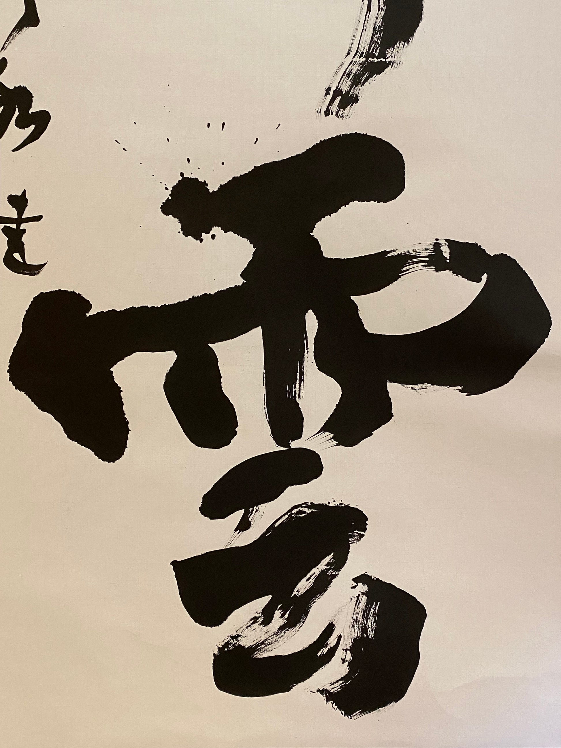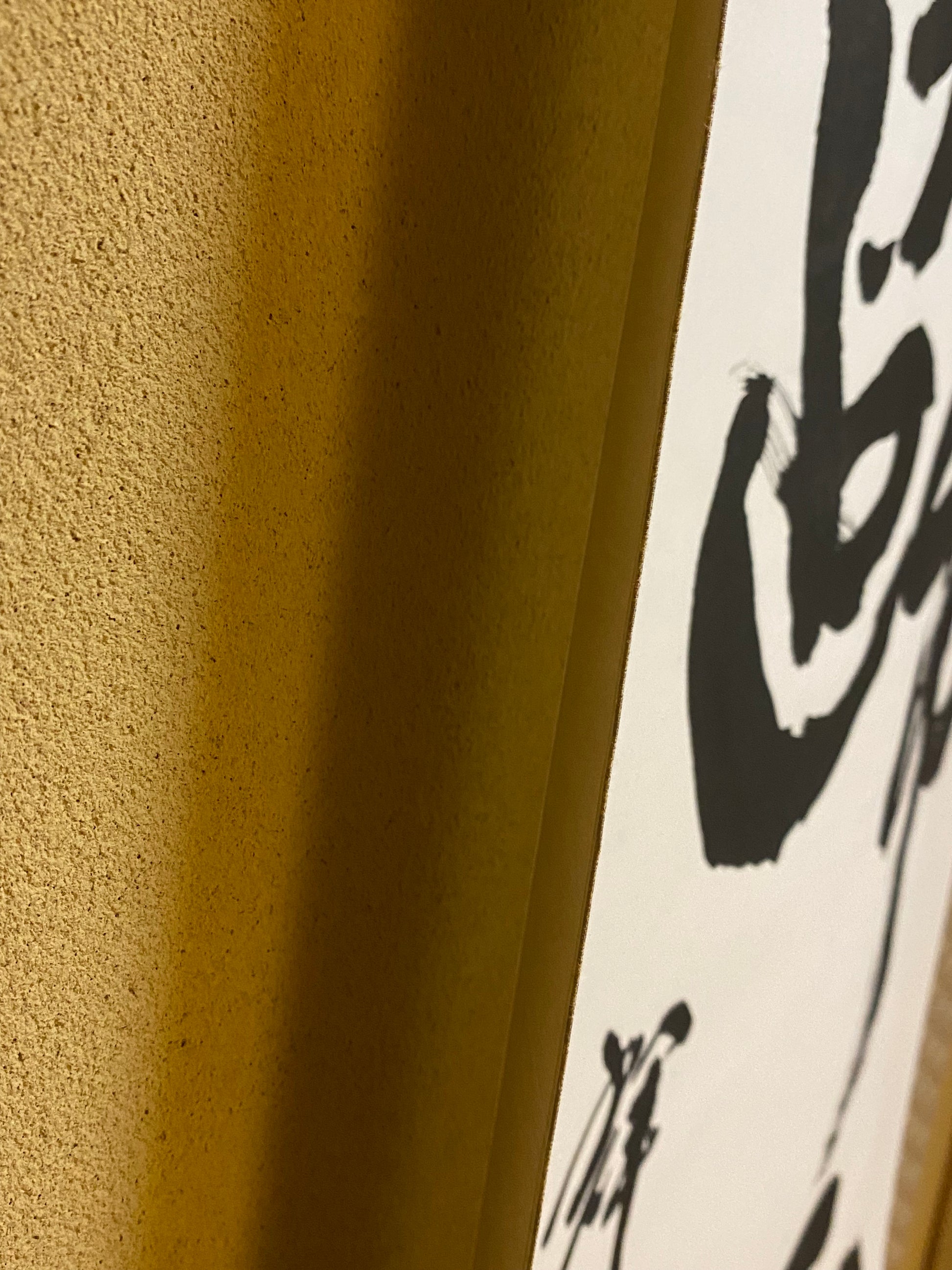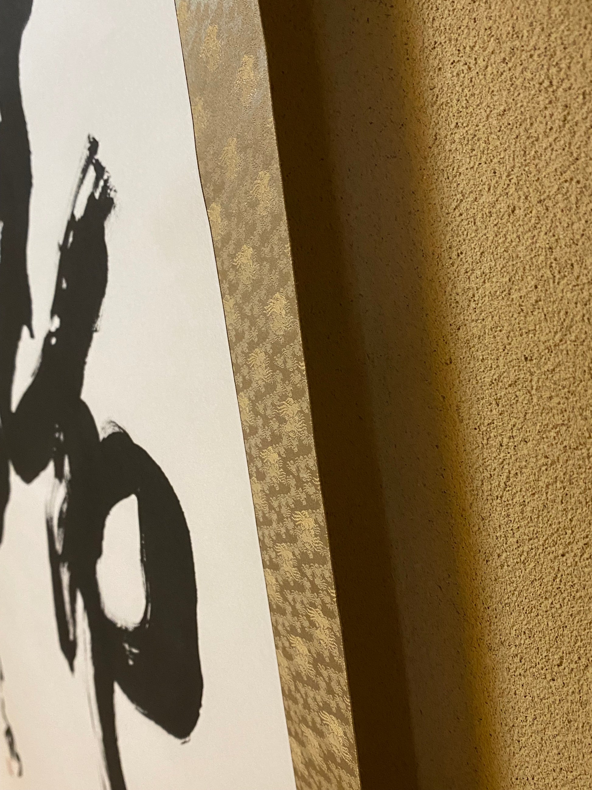 白と黒の境界線が美しい作品です。迫力のある作品ですが、曲線のある文字の形とベージュの表具で柔らかさも感じます。是非、大きめの作品にもチャレンジ!お気に入りの場所に飾ってみてくださいね。
