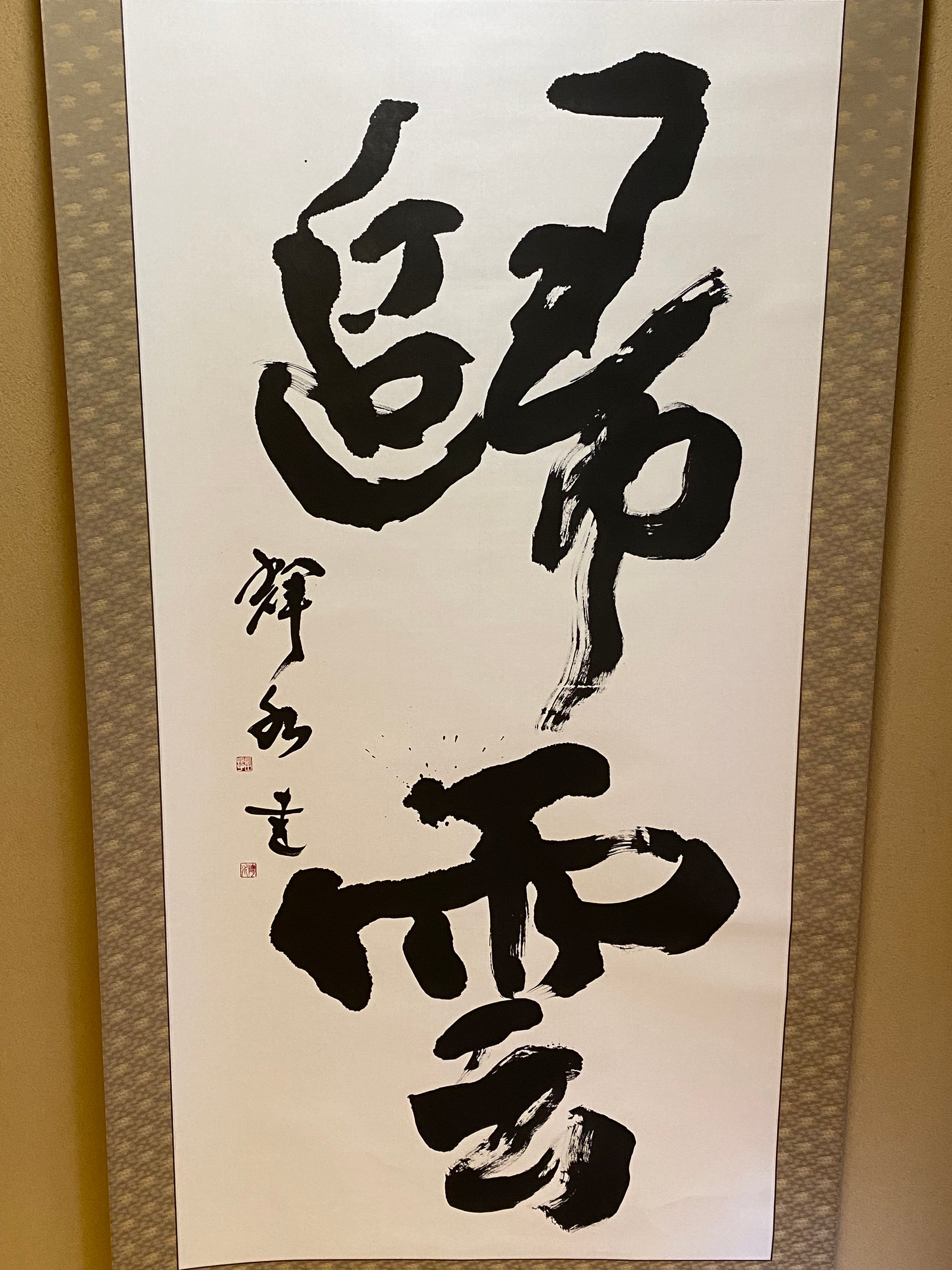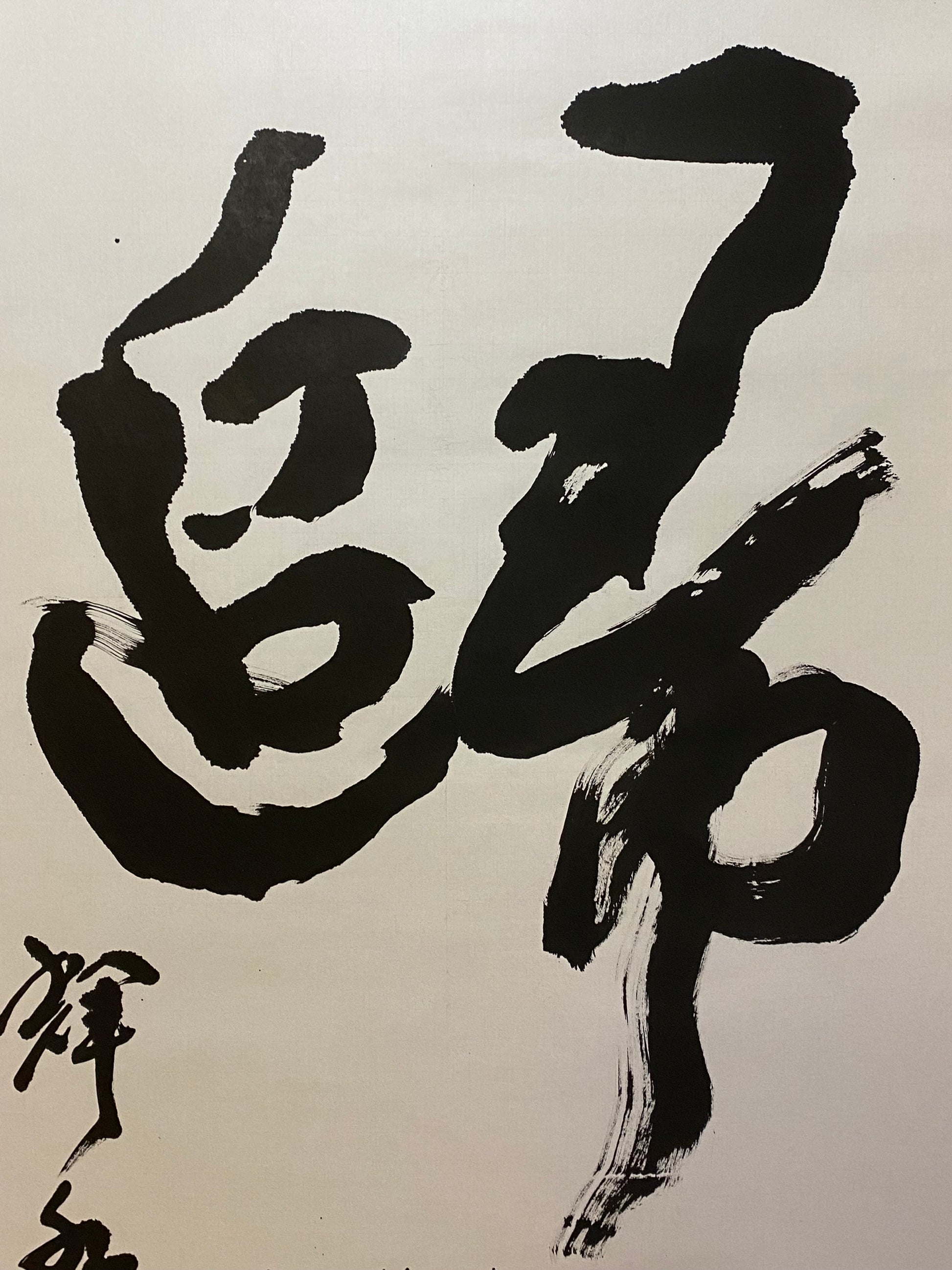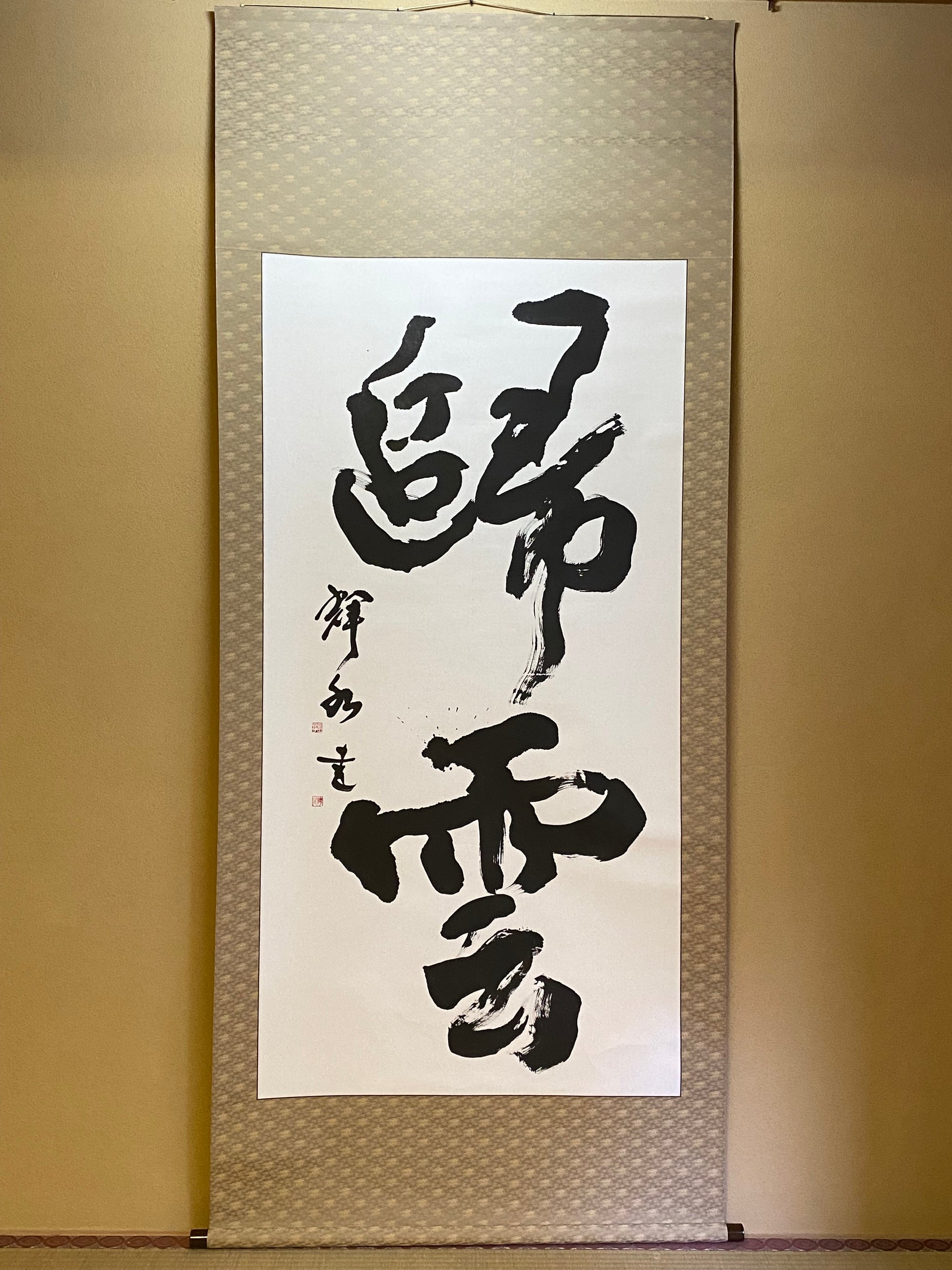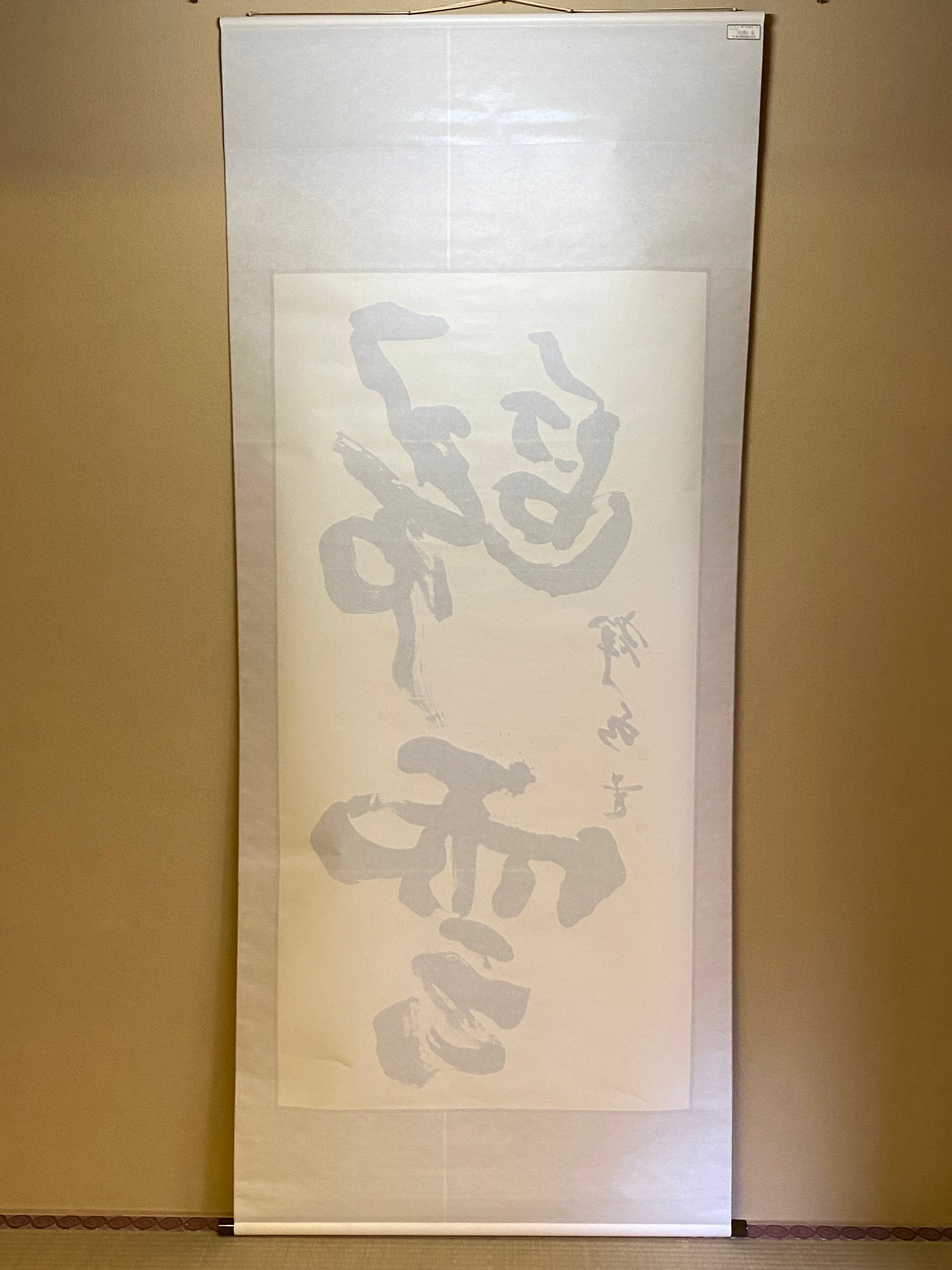 白と黒の境界線が美しい作品です。迫力のある作品ですが、曲線のある文字の形とベージュの表具で柔らかさも感じます。是非、大きめの作品にもチャレンジ!お気に入りの場所に飾ってみてくださいね。
