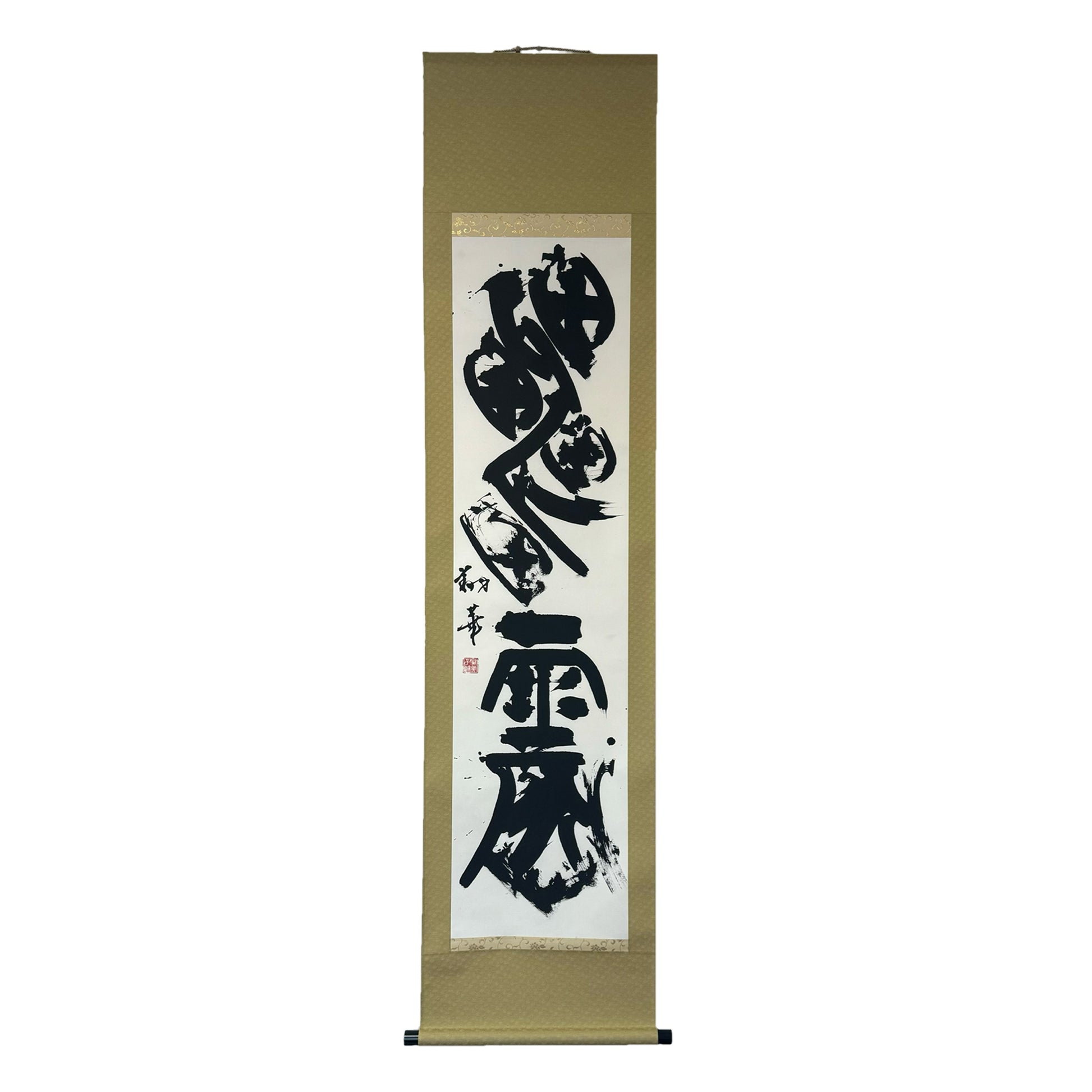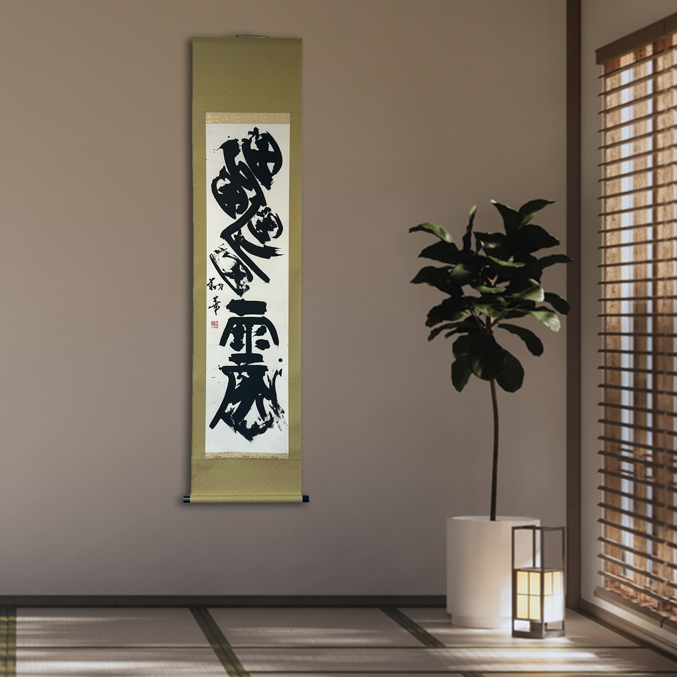 【SIZE】H1895mm×W455mm×D30mm(作品部分 H1358mm×W343mm×D1mm) 【WEIGHT】520g 【作品材料】墨、画仙紙 【作品ストーリー】雷震」意味は雷が鳴り響くこと。書体の中で最も古い篆書で表現をしました。「雷」の字は、田んぼの中に雷落ちた様子です。 [Thunder Shaking] 【作品のポイント】条幅のサイズに2字で仕上げ、雷が落ちている様子と迫力に重きを置いて制作しました。 |