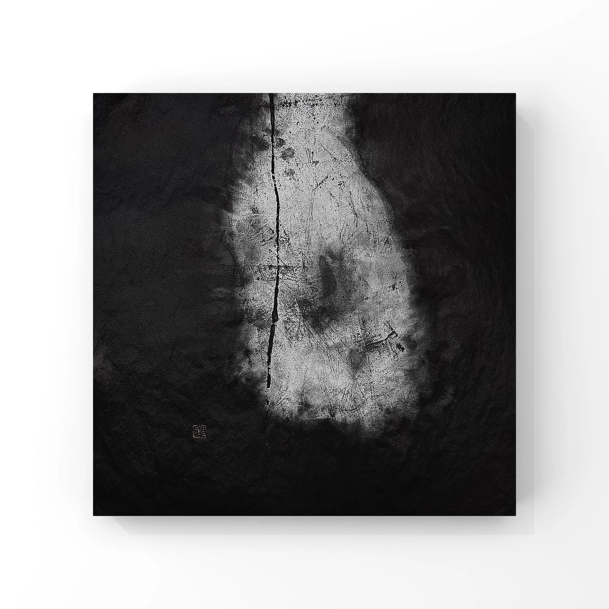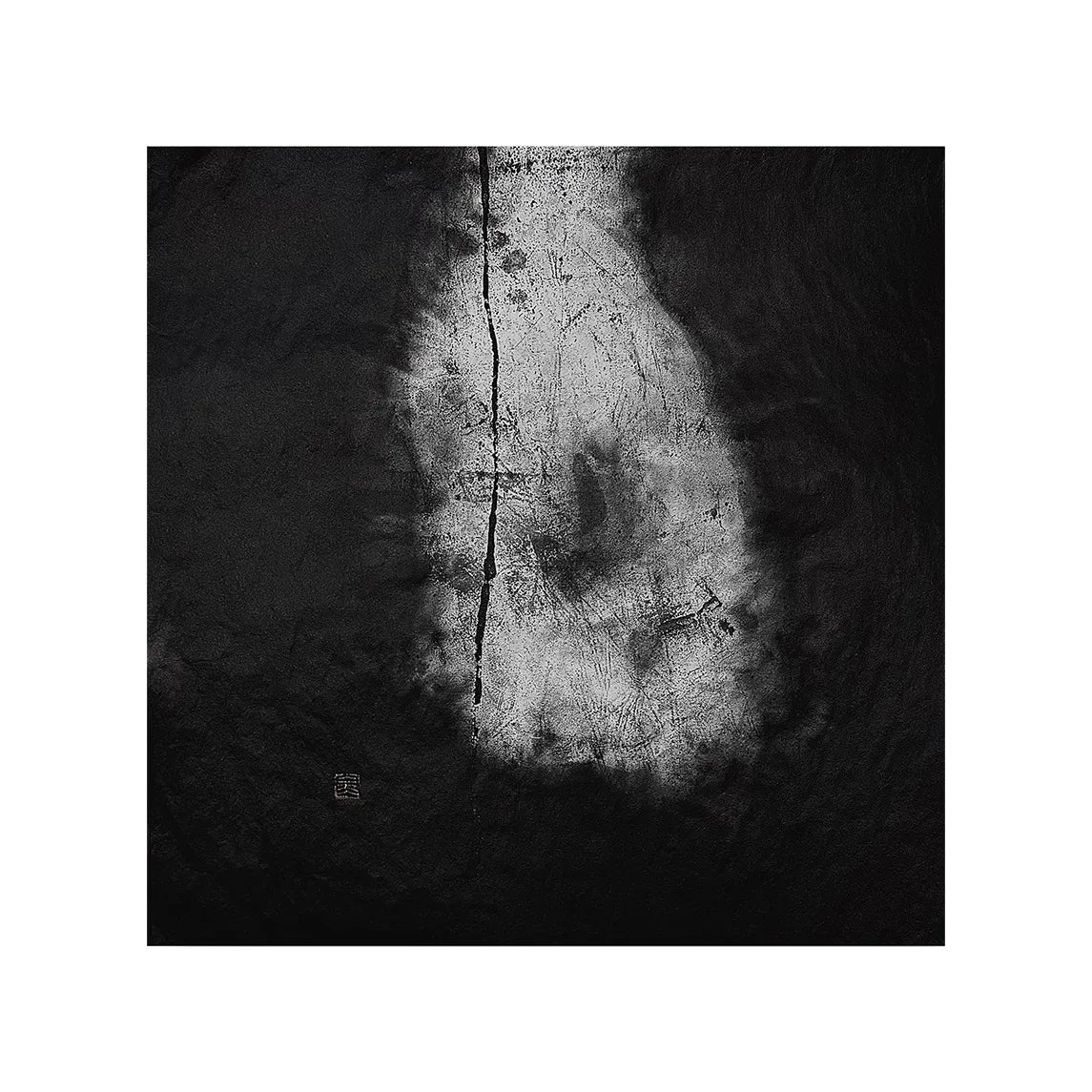 【SIZE】H700mm x W700mm 【WEIGHT】500g 【作品材料】画仙紙・墨 【作品ストーリー】 私の作品は、言葉や文字が持つ“制限性”への問いかけを根源とする。 言葉が事象を囲み、さらに文字が言葉を閉ざす。この一連の行為のは、ある種の内なる矛盾を孕んでいるのではないか。書と対峙する時、そんな想いが常に心に湧き上がる。 「あわい」作品群は、この言語による制限から解放され「本来の姿」へ立ちかえる道を、事象本来の波長が持つ「微かな残り香」を手がかりに辿る、探求の一片である。 それは、紙に独自に配合した墨のみ(白抜剤などの特殊な素材は一切使用していません)で描くことによって、これまで以上に墨と紙の可能性を追求する試みであり、また同時に、描いた言葉ないしそれを示す具象、そしてそれらの意味、そのそれぞれの「あわい…間」にあるものを、墨と紙の個性の重なりと変化によって顕在化させ、一層深化した姿を見出す試みでもあります。 まず最初に、言葉やその意味を示すための墨を置き、次に紙全体を墨で覆い、乾燥とともに具象が現れるのを静かに待つ。 定着したはずの墨が、やがて抜けていく。 そんな不可逆的な現象は、幾重にも及ぶ一度きりの出来事(一回性)の集積として「あわい」の姿を発現させる。 それは、墨の五彩…「青」「黒」「紫」「白」「赤」…が創りあげた無限の色彩が、様々な紙の個性と出会うことで「紙」と「墨」の境界が溶解し、そのあいだに生まれた曖昧で移ろう領域の或る瞬間の風景である。 またそれは、形而の上と下である。 墨は、そんな矛盾を飽和しながら「あわい」を可視化してゆく。全て“在る”と“有る”の「あわい」なのだと諭しながら。 白なのか、黒なのか いずれにしても、あなたの目に映ったこの瞬きは、永遠の中の“今”であり、それは今と云う“次の一瞬”であることだけは、これまでも、これからも変わらない。 【備考】 この「あわい」のシリーズは、表具の仕様によって、その表情が一変します。 ・作品が一層皆様の日常に寄り添えること を重要視し、あえて原画のままにて展示・販売しています。表具のイメージや飾り方など、何なりとおたずねください。 この作品のある風景が、皆様の日常になることを願って。 |