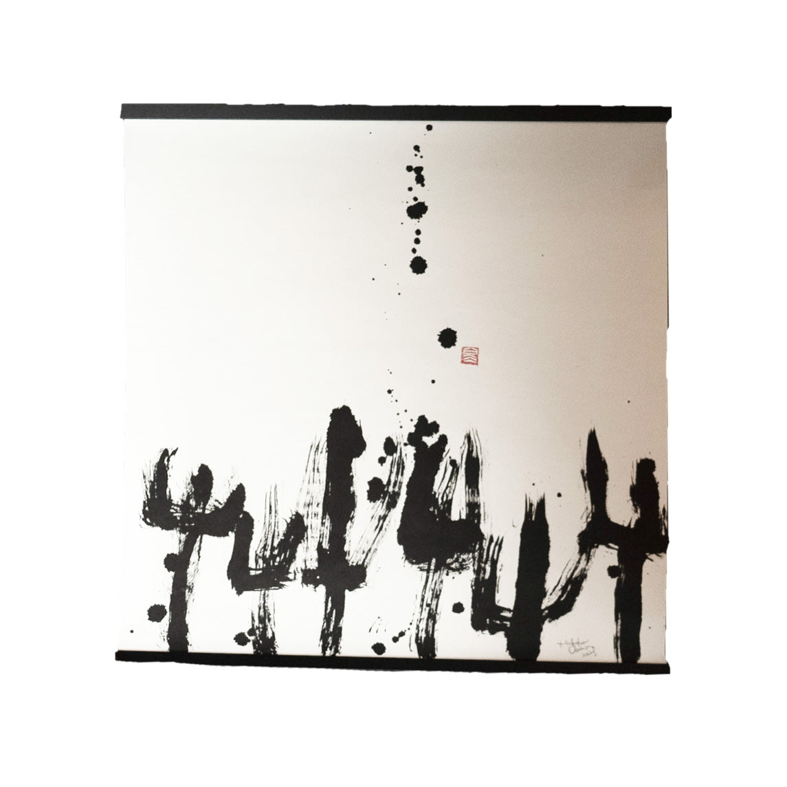 【作品材料】紙 墨 【作品ストーリー】 草の葉に置いた露。それはすぐに消えてしまうところから、命の儚さをたとえた言葉。でも、命の儚さは、根底に生きる強さがあってこそのものだと思うのです。 |