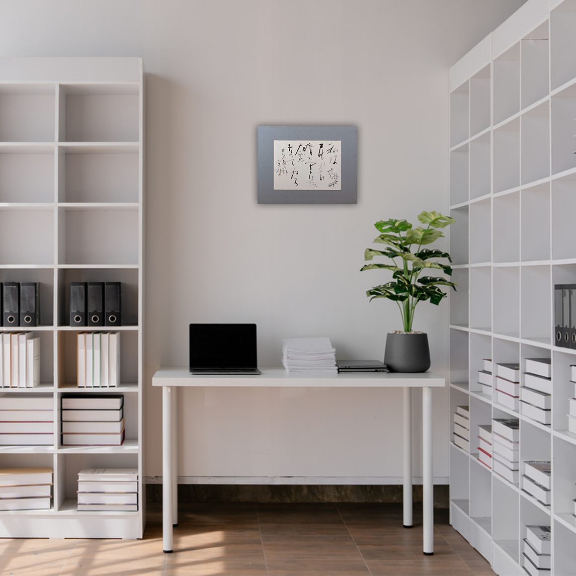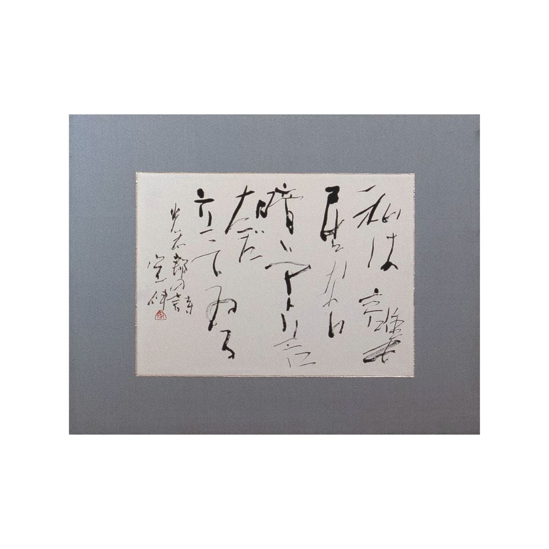 【SIZE】H392mm×W530mm×D17mm(作品部分 H249mm×W337mm) 【WEIGHT】570g 【作品材料】画仙紙、中国墨 【作品ストーリー】「私は誰もいない暗いアトリエにただ立っている 智恵子抄で知られる高村光太郎の詩。智恵子亡き後に書かれたもの。 突き刺さるような孤独な詩です。 明るい詩や、美しい詩が好まれる事が多いかもしれませんが、 言葉では説明しきれないリアルで深い心情をすくい上げたような 詩に魅力を感じ、選んで書きました。