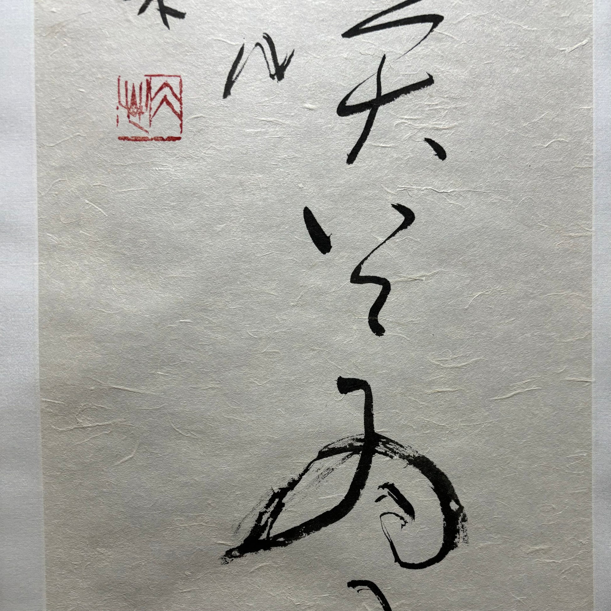 Staff Comment Thinking about being drawn on a larger scale, this calligraphy work has certain impacts because of the size. On the other hand, soft coloration is creating a mild atmosphere. Writing in both Japanese characteristics HIragana and Chinese characteristic Kanji leads the viewer to enjoy the different use of the space. The Kakejiku works are easy to put away. I would recommend changing and enjoying Kakejiku works when the use and atmosphere for example,the season change. The line changes depending on the feature of a brush. I would like you to see and feel the special texture created by feathers. |