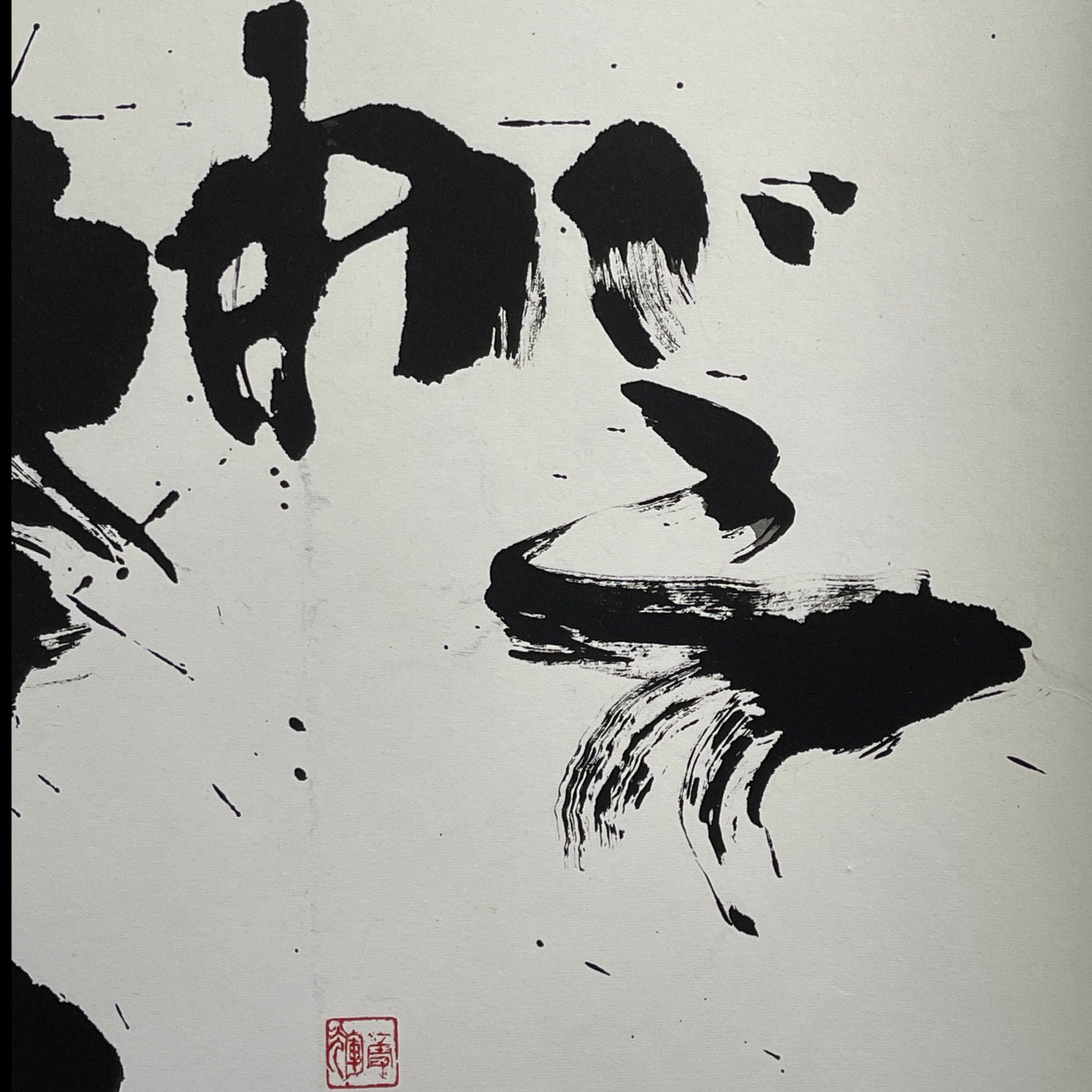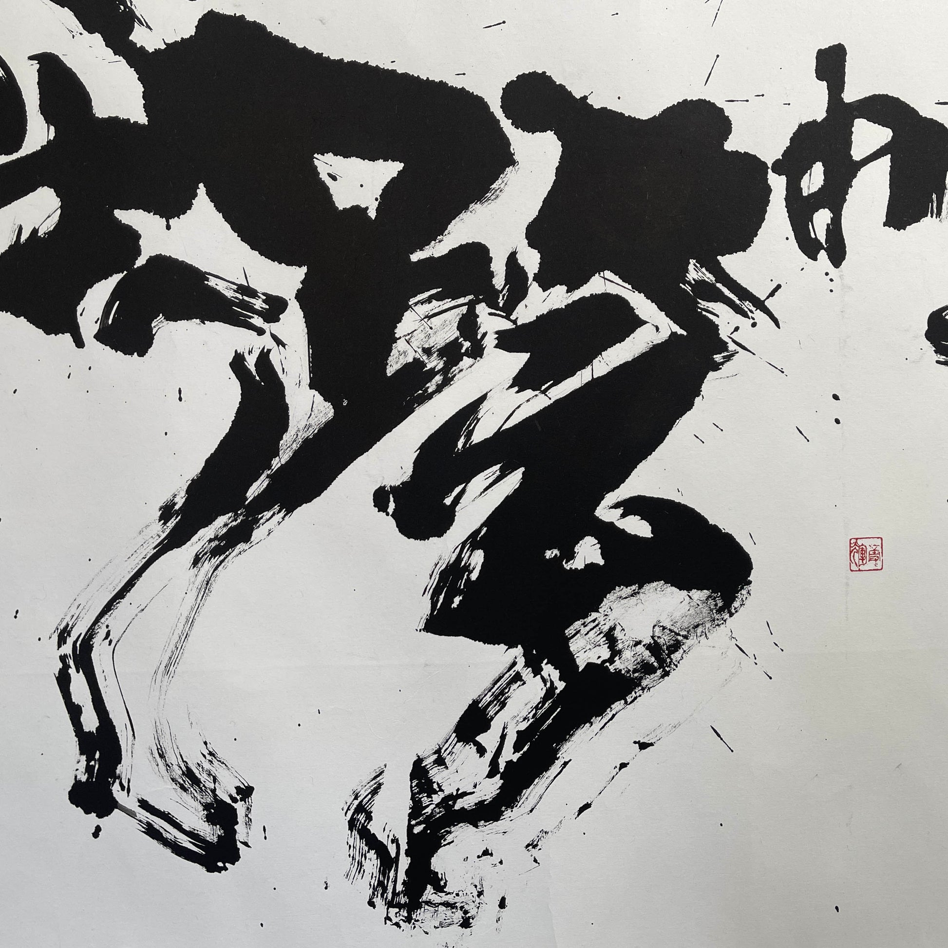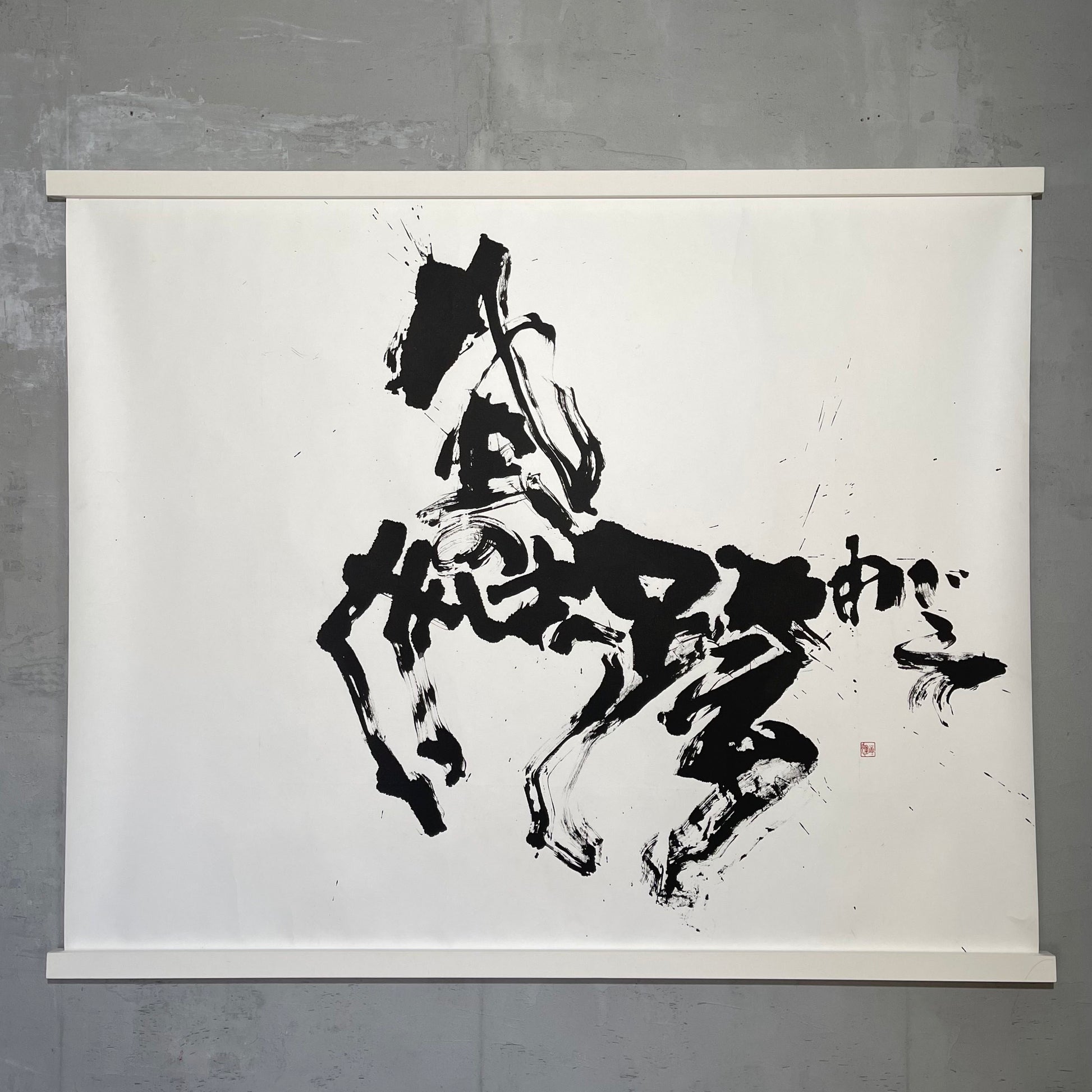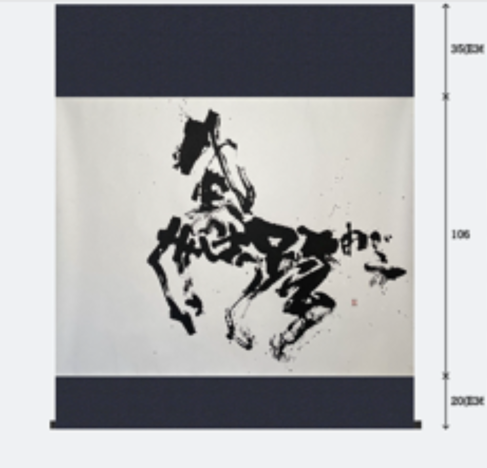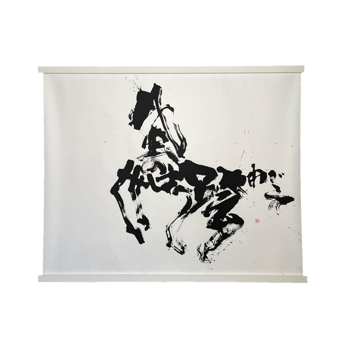 唯一無二で書道やアートの楽しさ、ワクワクする気持ちを与えてくれる作品です。空間の中で馬がゆっくり駆けているようにも感じます。大きめの作品ですが美しい余白で圧迫感を感じません。是非作家ストーリーもお読みいただきポジティブな書道作品をお迎えください。