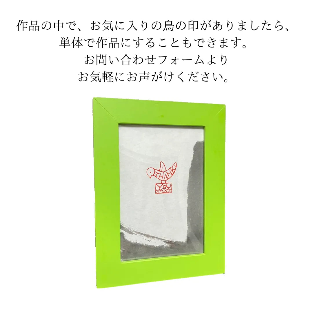 書における分野の一つ「篆刻」(石に文字を彫った印)を用いた作品です。表情豊かな鳥たちと、平和の象徴とも言われる鳥を表すピースフルな英単語も刻まれています。